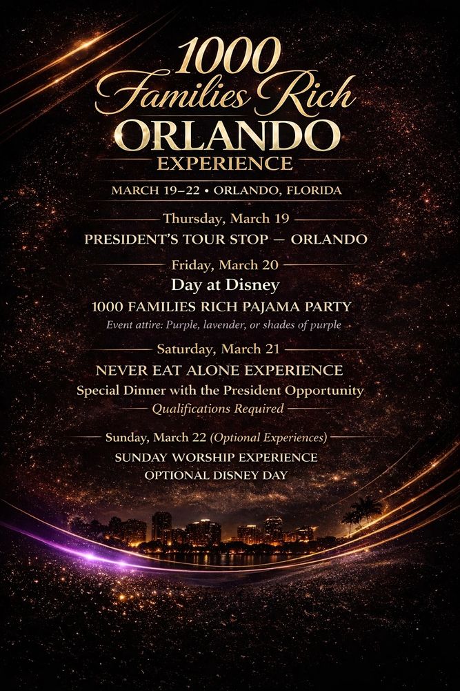 Join us for an unforgettable Disney Day during the 1,000 Families Rich Orlando Presidential Stop Experience. This day is all about connection, memories, and legacy as we enjoy the park together as a team.